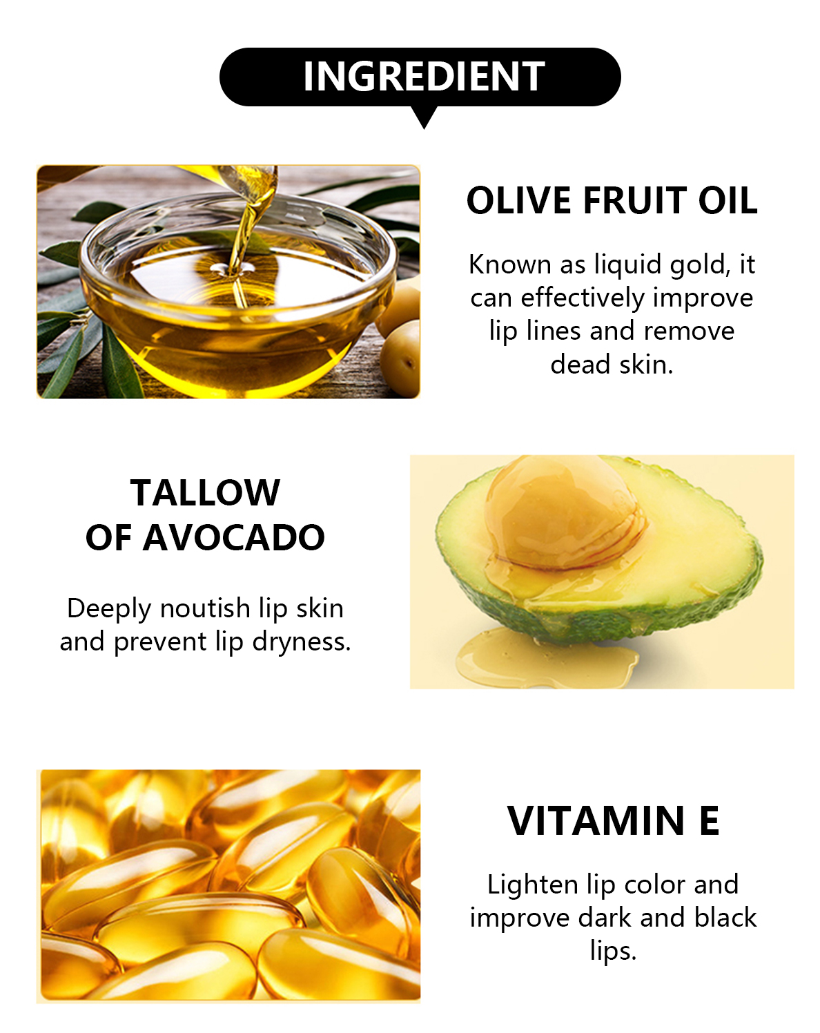 Olive Fruit Oil, Avocado Extract (Tallow of Avocado), Vitamin E (Tocopheryl Acetate), Beeswax, Shea Butter, Hydrogenated Polyisobutene, Mineral Oil, Candelilla Wax, Caprylic/Capric Triglyceride, Microcrystalline Wax, Ethylhexyl Palmitate, Flavor/Fragrance, CI 19140 (Yellow 5), CI 15850 (Red 7 Lake), CI 77891 (Titanium Dioxide), Phenoxyethanol, Ethylhexylglycerin