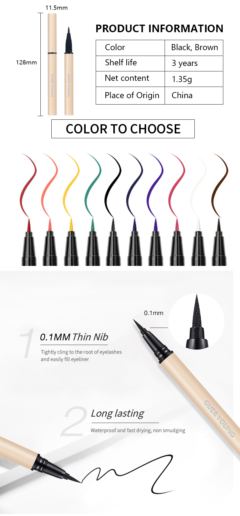 Create flawless eye looks with the GUER YOUNG waterproof eyeliner pen. Designed with a 0.1mm ultra-fine tip, this eyeliner delivers smooth, precise lines that dry quickly and stay smudge-free all day. Its waterproof formula resists sweat and humidity, yet it’s easy to remove. Available in multiple intense shades, it's perfect for natural definition or bold graphic styles.